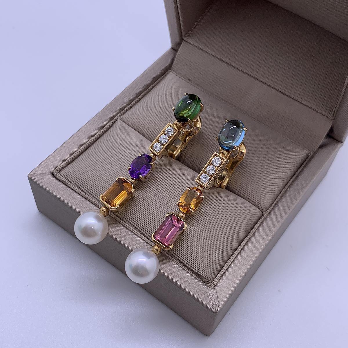 Bvlgari Allegra High Jewelry Series Earrings. Crafted in premium 18K gold base, inlaid with multi-color precious gemstones including amethyst, tourmaline, topaz and citrine, matched with high-luster round pearls and brilliant-cut accent diamonds. Italian luxurious design, gorgeous and elegant. Ideal for daily wear, banquet styling and gifting.