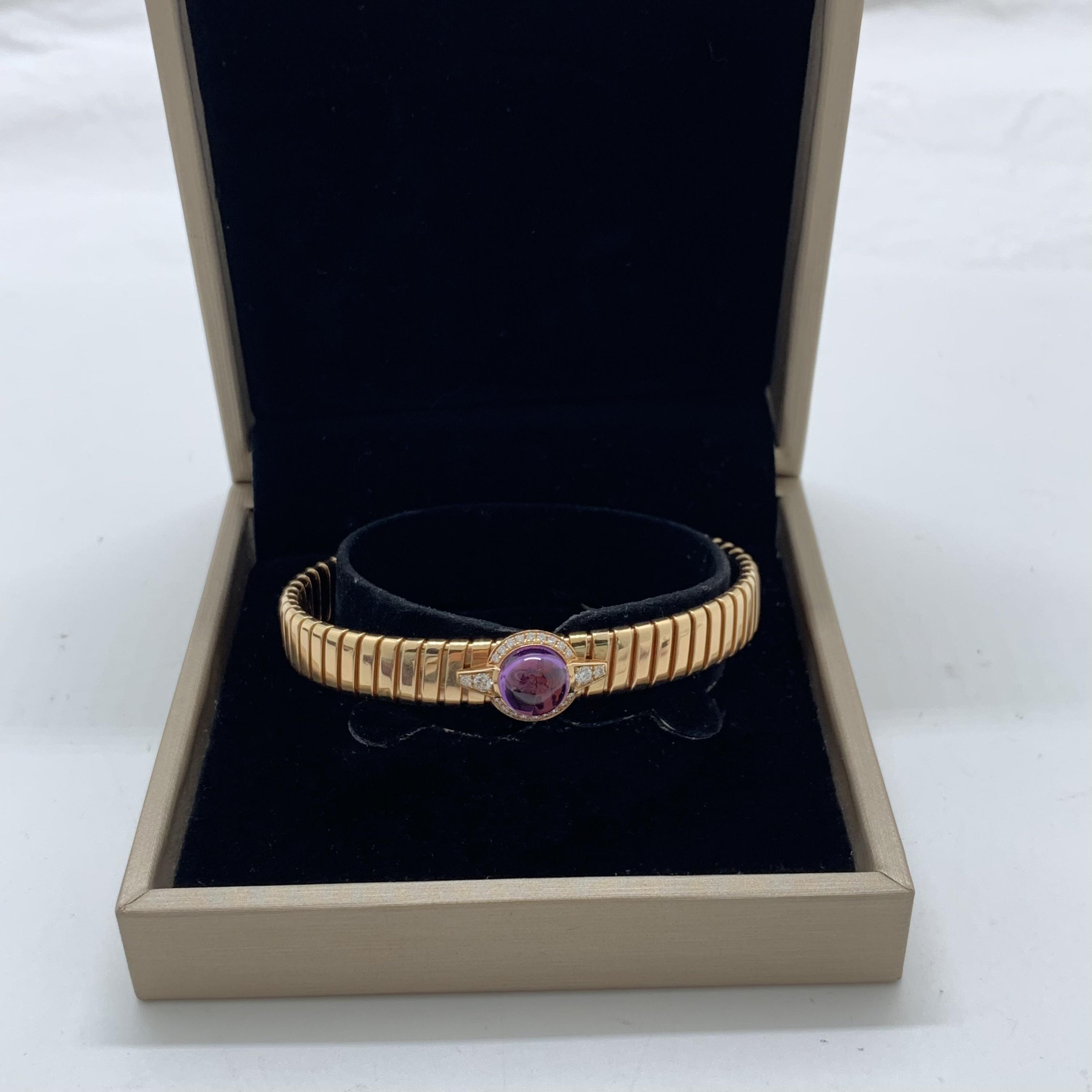 BVLGARI Tubogas Bracelet in Rose Gold with Amethyst, Size M. Full vintage vibe. Gold weight 42g. Complete with box and warranty card. Perfect for personal use or gifting.