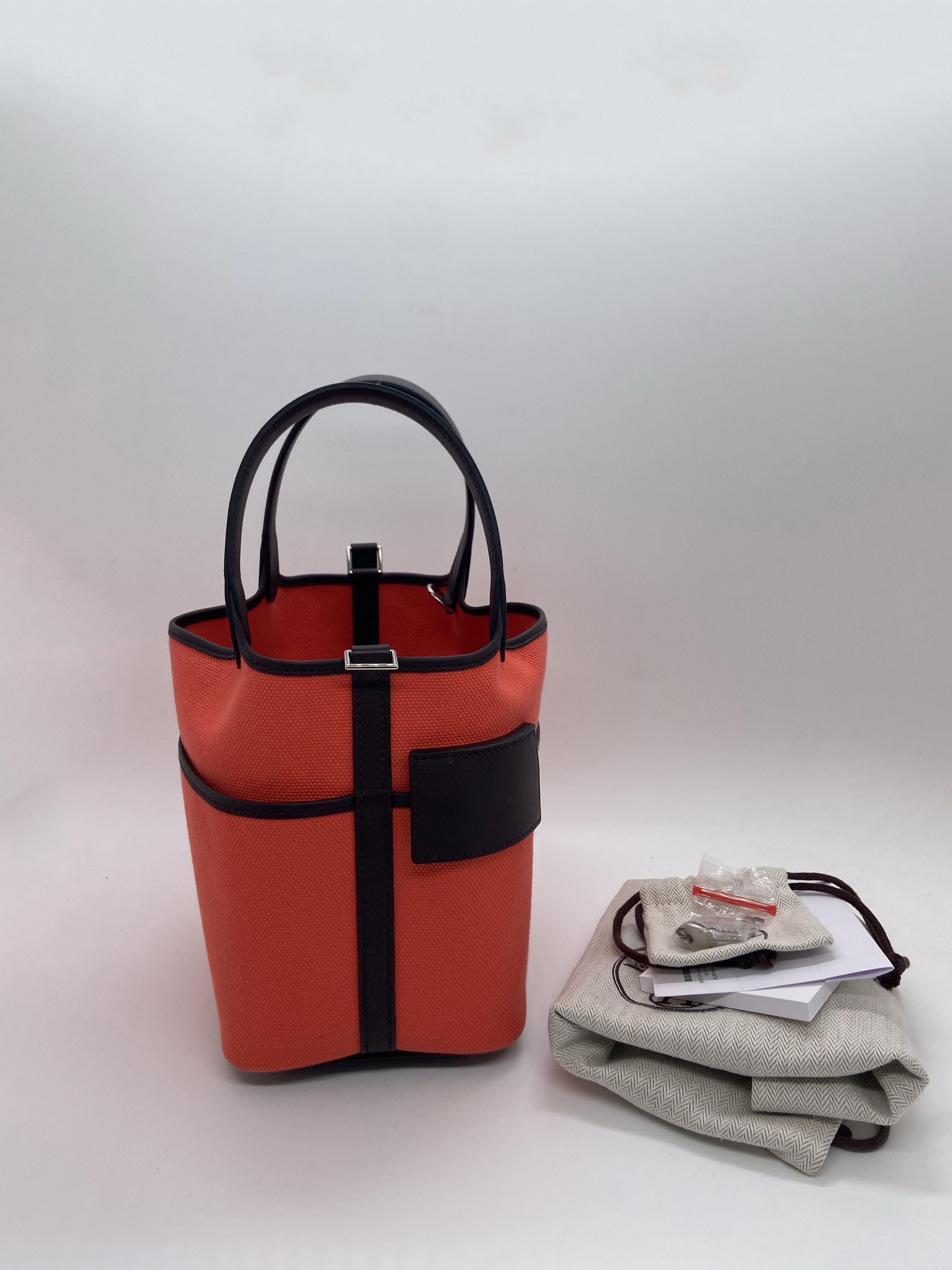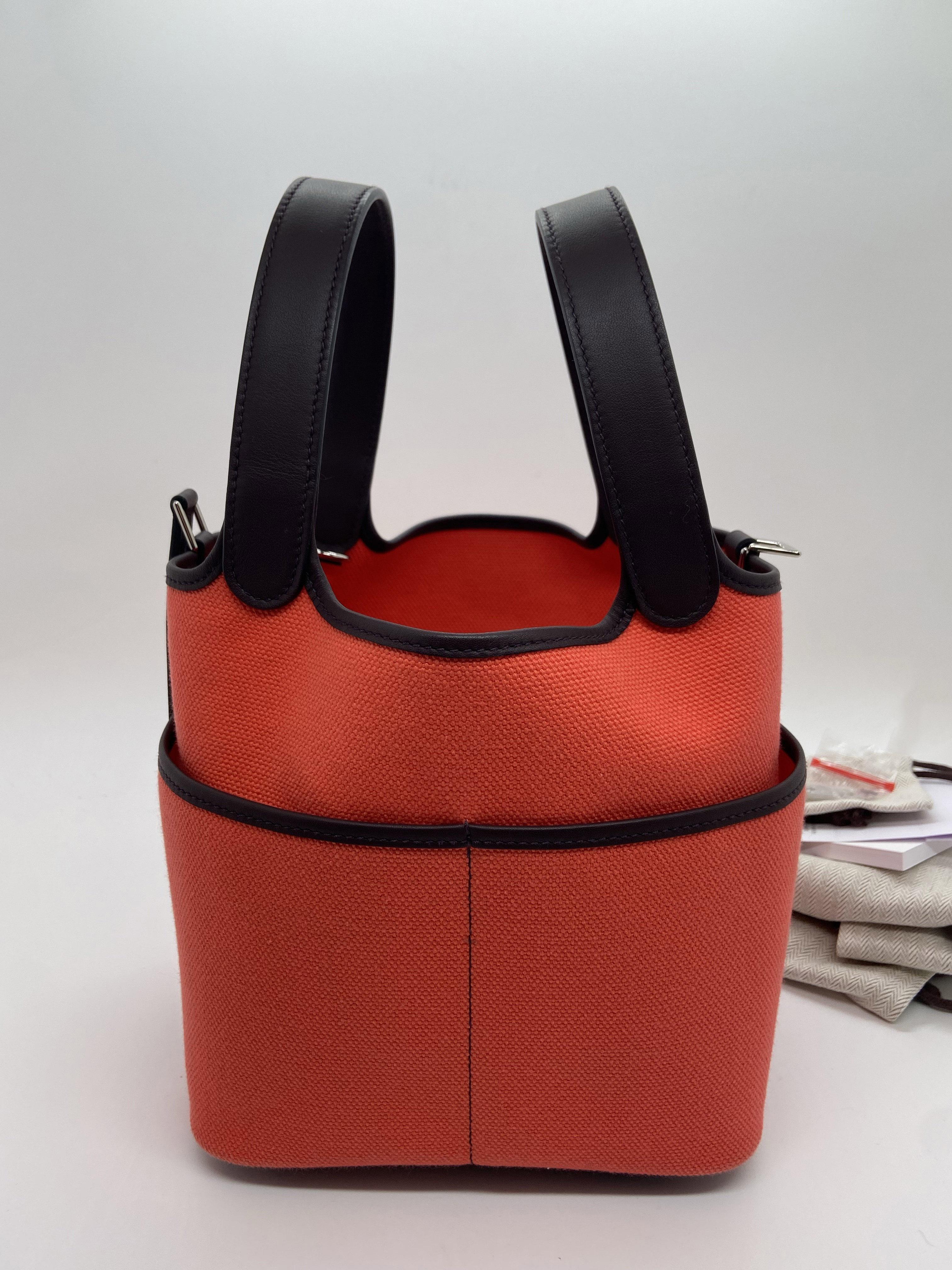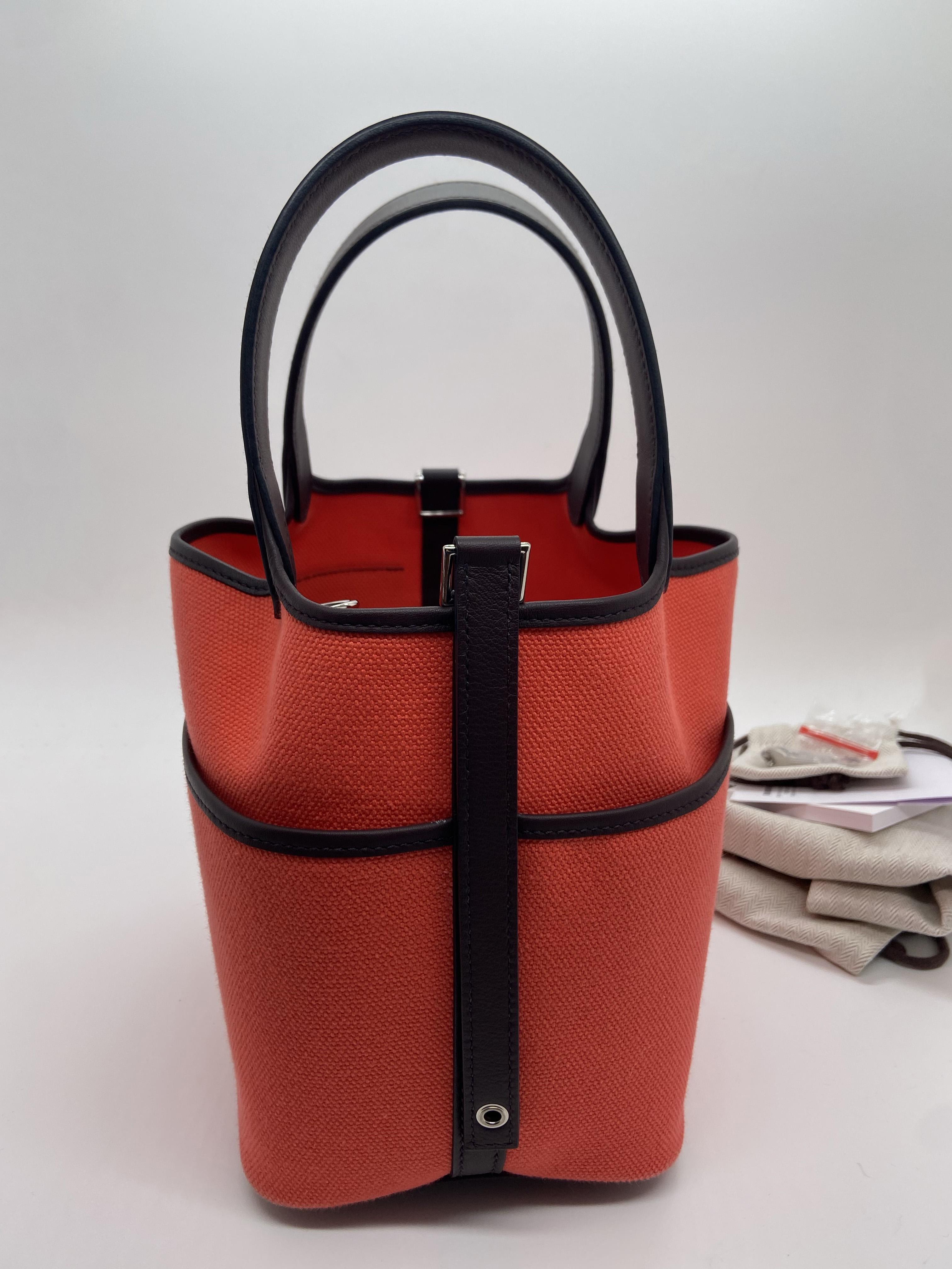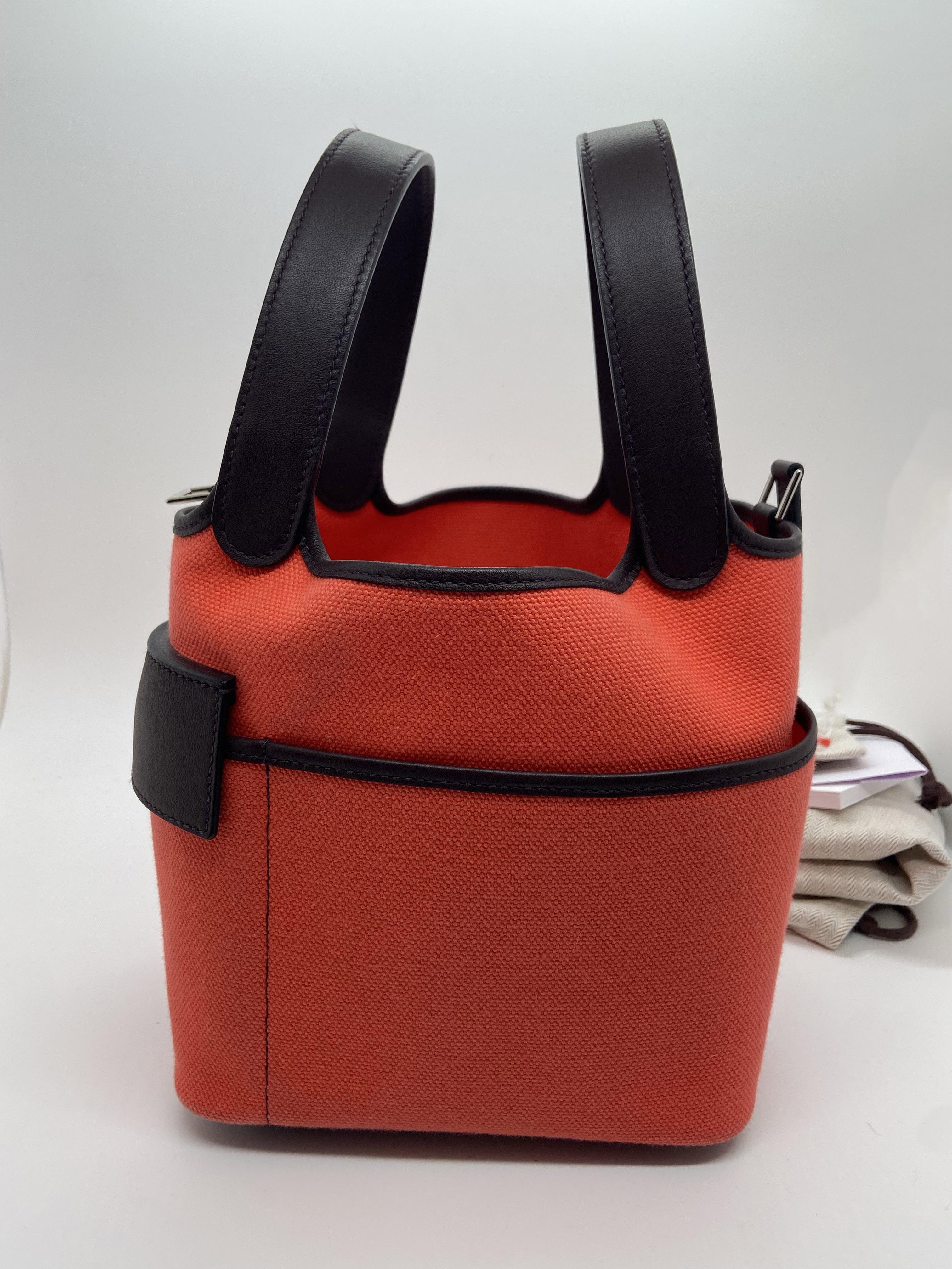 Hermès Cargo Picotin Lock bucket bag, Texas Pink with Saddle Red, Palladium hardware. Slight darkening at the corners, minor scratches on the base, and light storage marks on the interior.